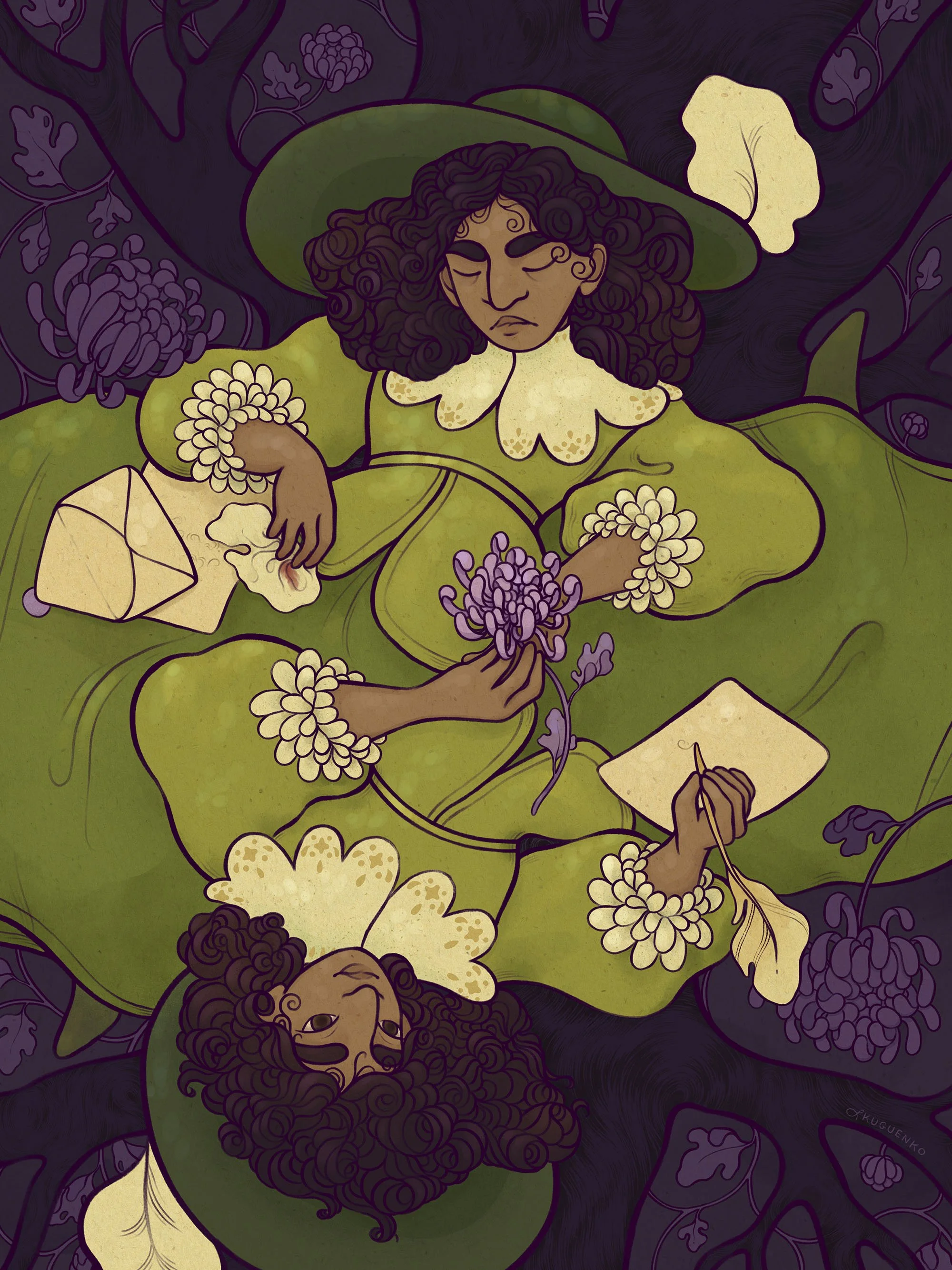 Seeing Double portrays the sighting of one's doppelgänger as an omen of death—a messenger passing along the news of impending demise with a contented smile, letter, and funeral flower. This piece was created for Light Grey Art Lab’s “The End is Nigh” exhibit, which explored the symbols, stories, and processes surrounding death around the world.